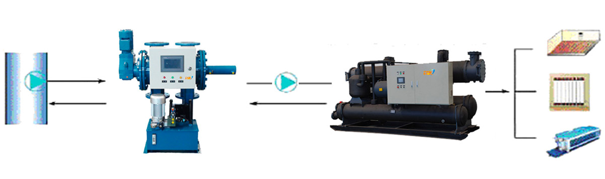 污水经提升后进入智能污水防阻机,过滤后的污水进入污水专用热泵机组,提温(或降温)后回到污水干渠。